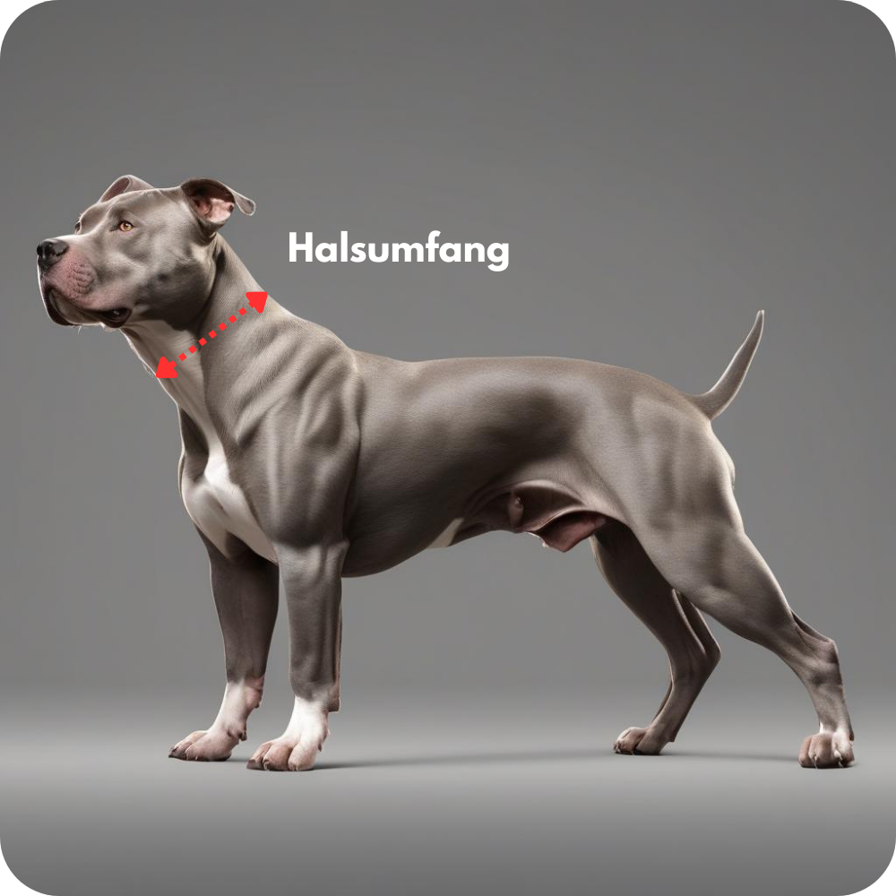 Nimm ein flexibles Maßband und lege es eng, aber nicht straff um die dickste Stelle des Halses, meist in der Mitte zwischen Kopf und Schulter. Du solltest zwei Finger bequem zwischen Maßband und Hals schieben können.